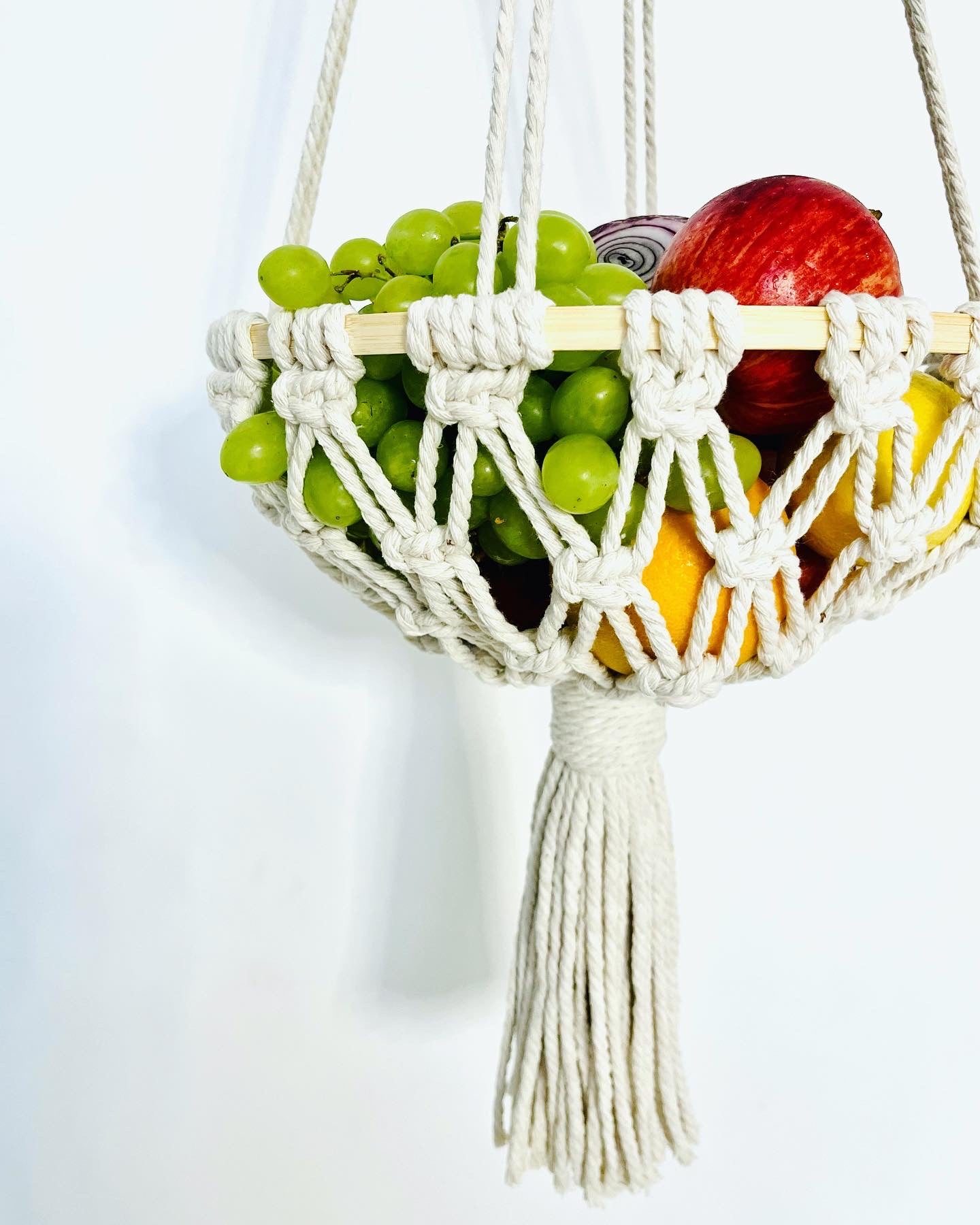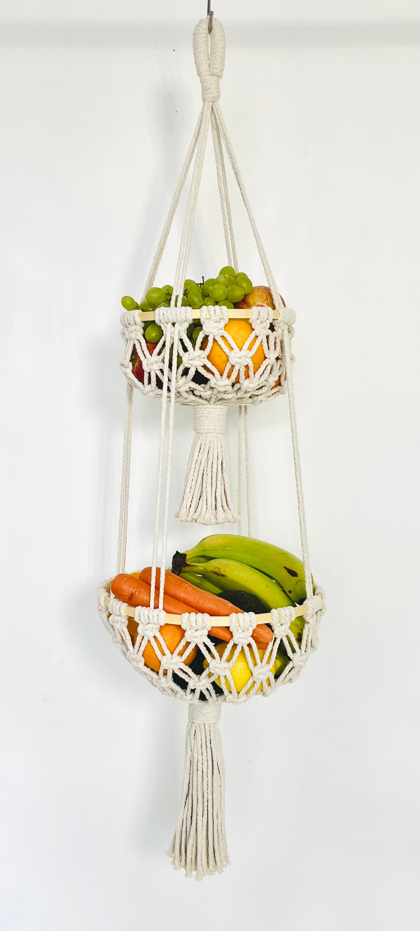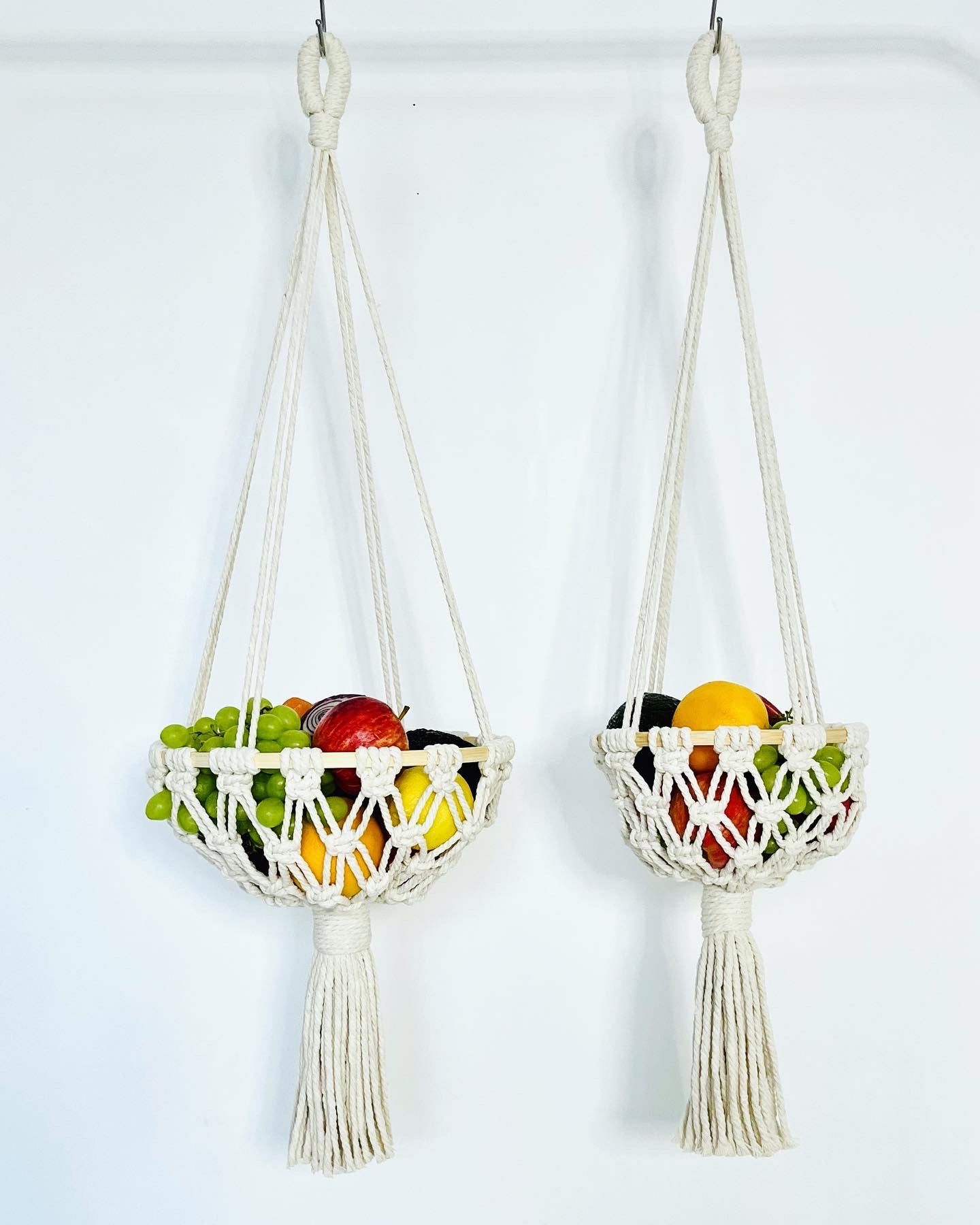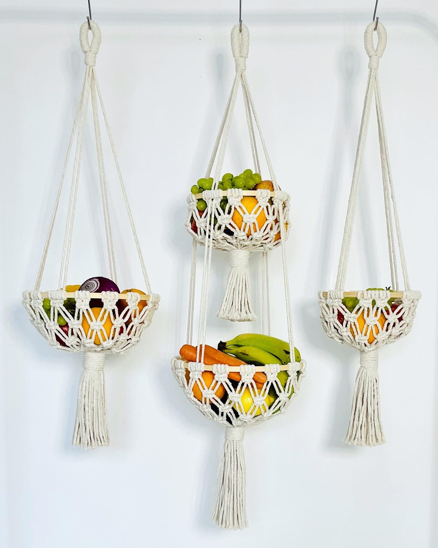 These single & double tier macrame baskets give you more storage space then any other basket solution before. Instead of taking up space on the table you can just hang your fruit or veggies on the wall and it even looks amazing!