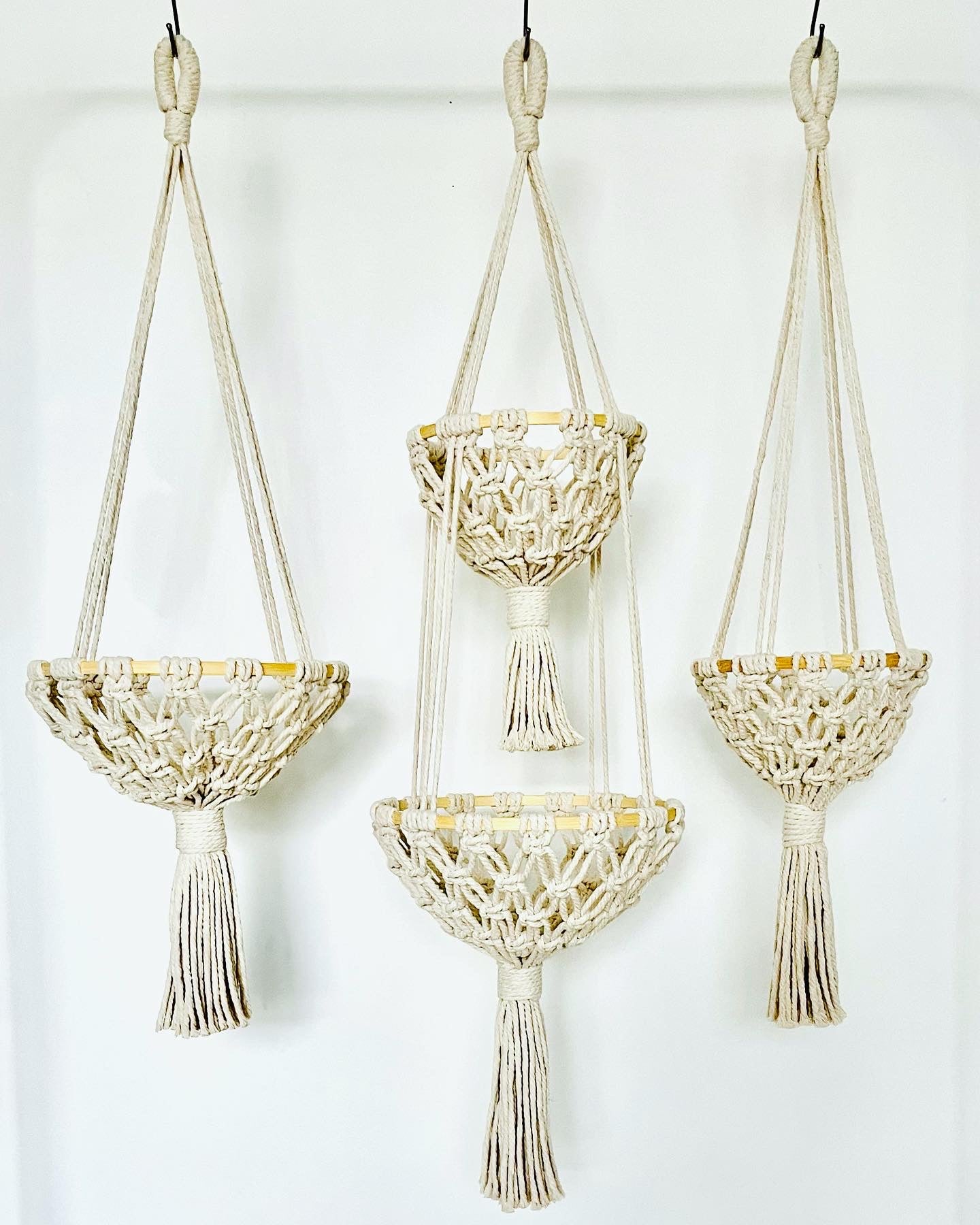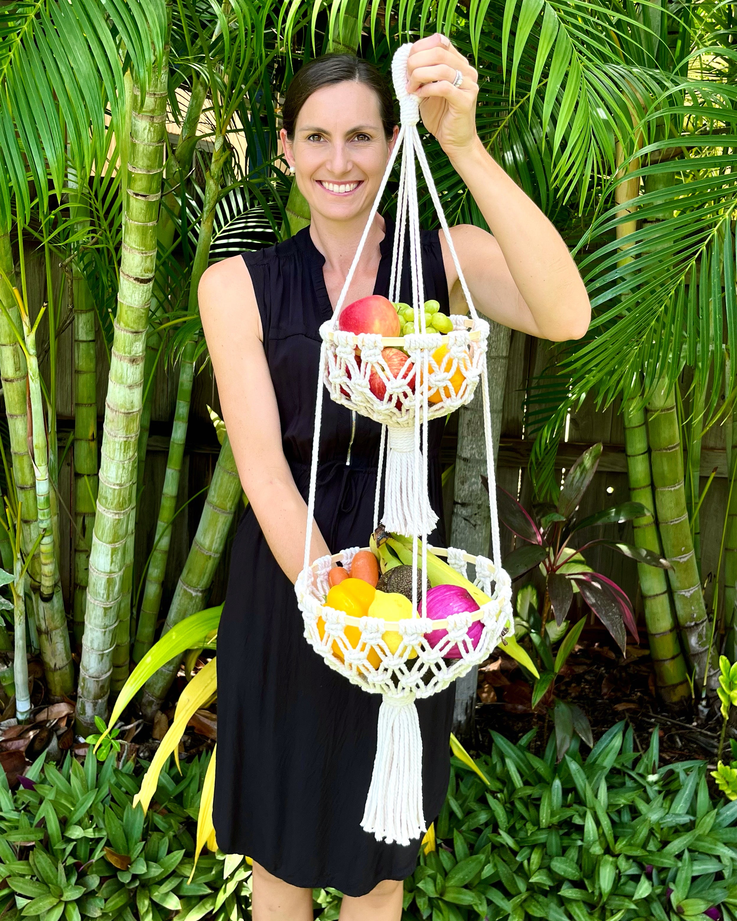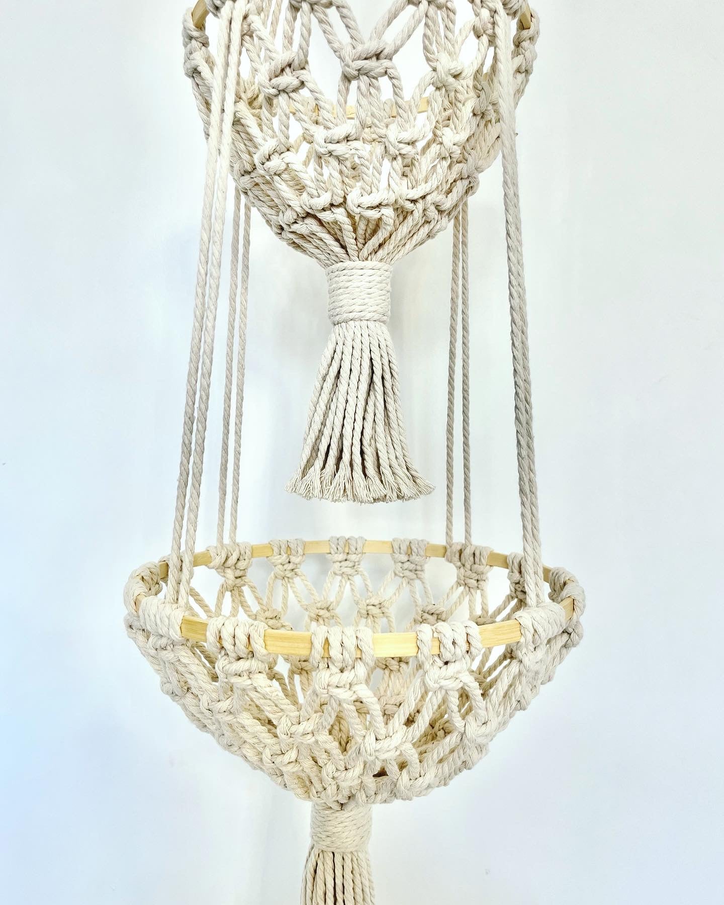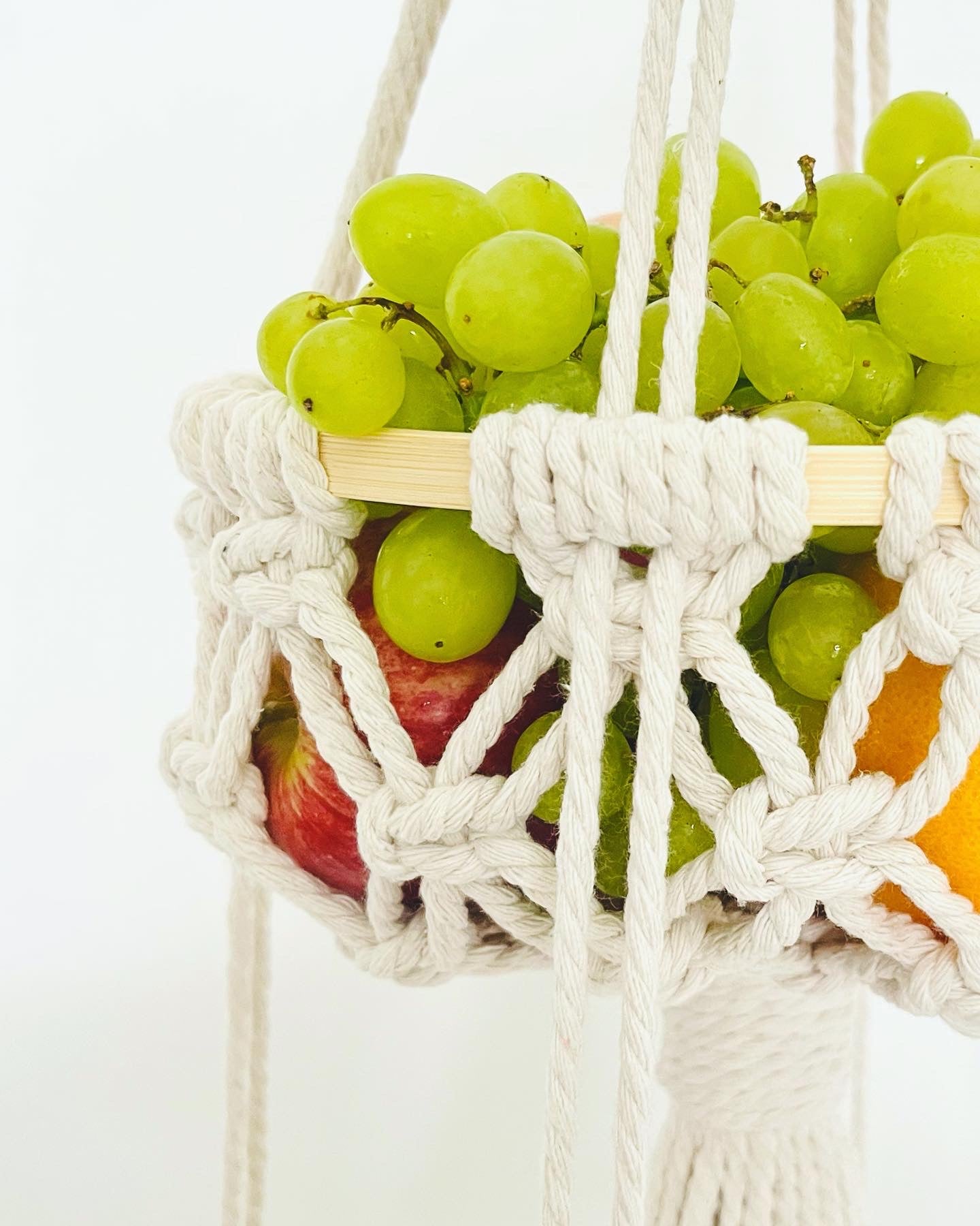 These single & double tier macrame baskets give you more storage space then any other basket solution before. Instead of taking up space on the table you can just hang your fruit or veggies on the wall and it even looks amazing!
