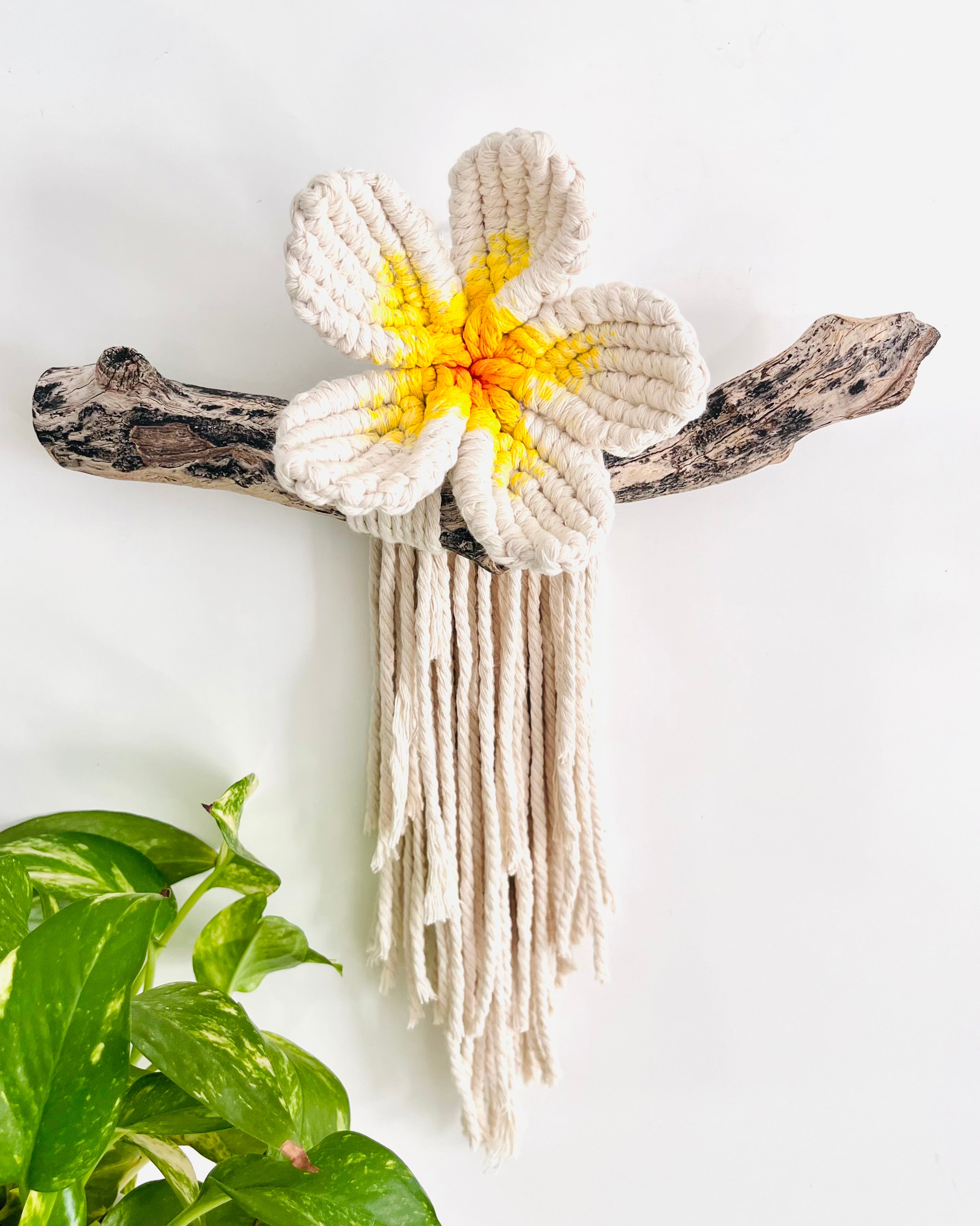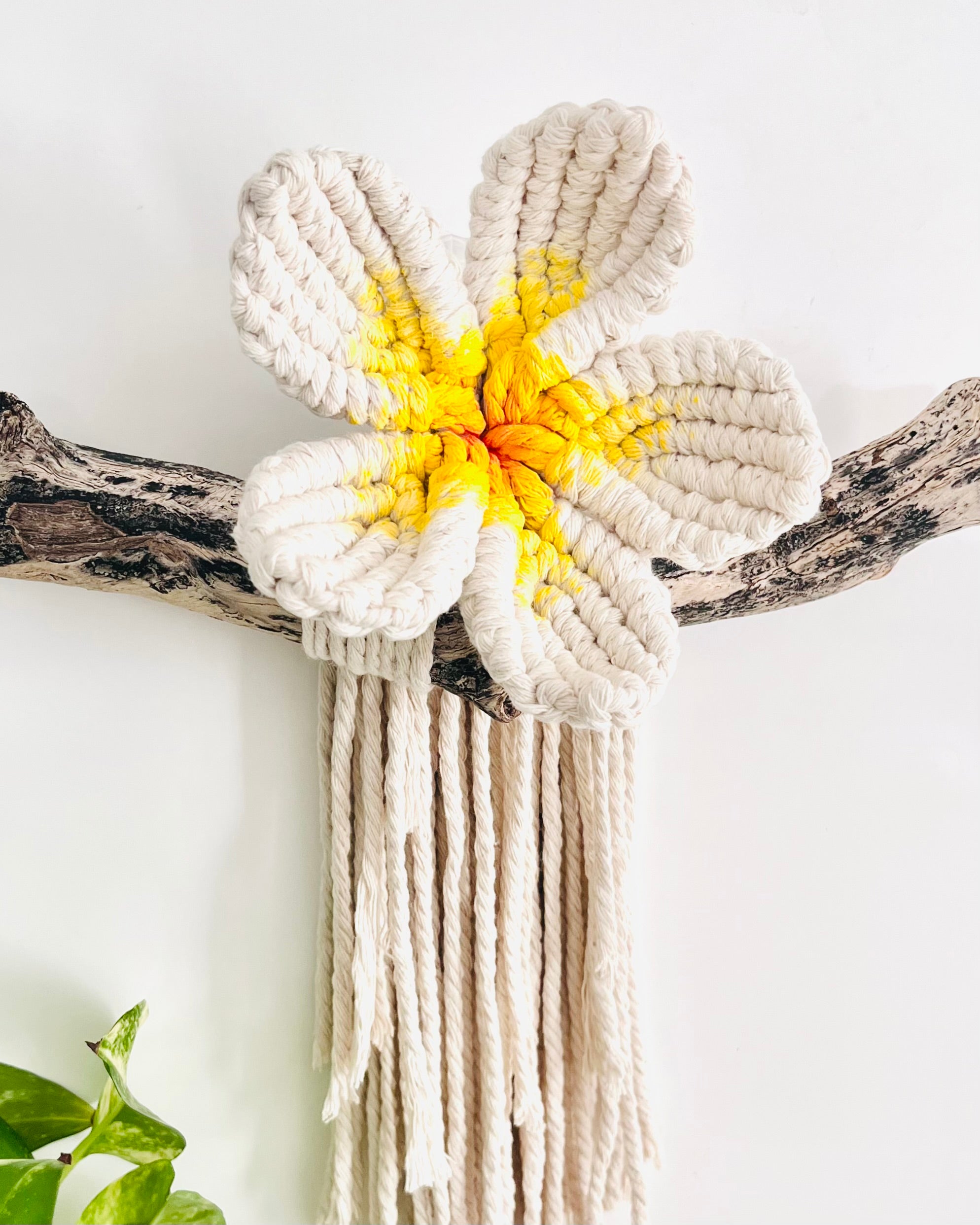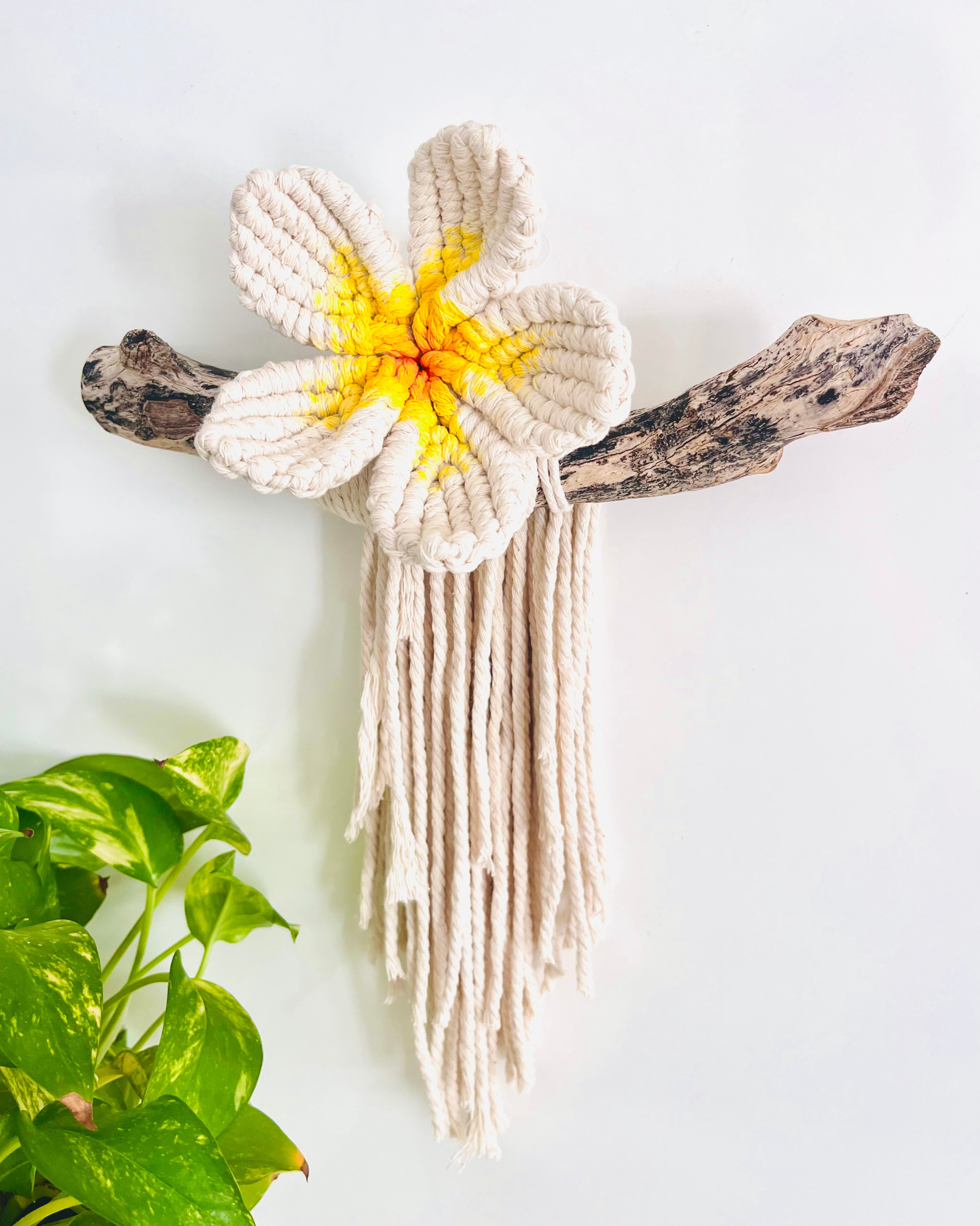 Inspired by the fragrant frangipani trees of Broome, this stunning macrame wall hanging captures the essence of tropical serenity. Soft textures and subtle detailing make the “Frangipani Flower” a graceful statement piece—perfect for bringing a breath of coastal calm into your space.
