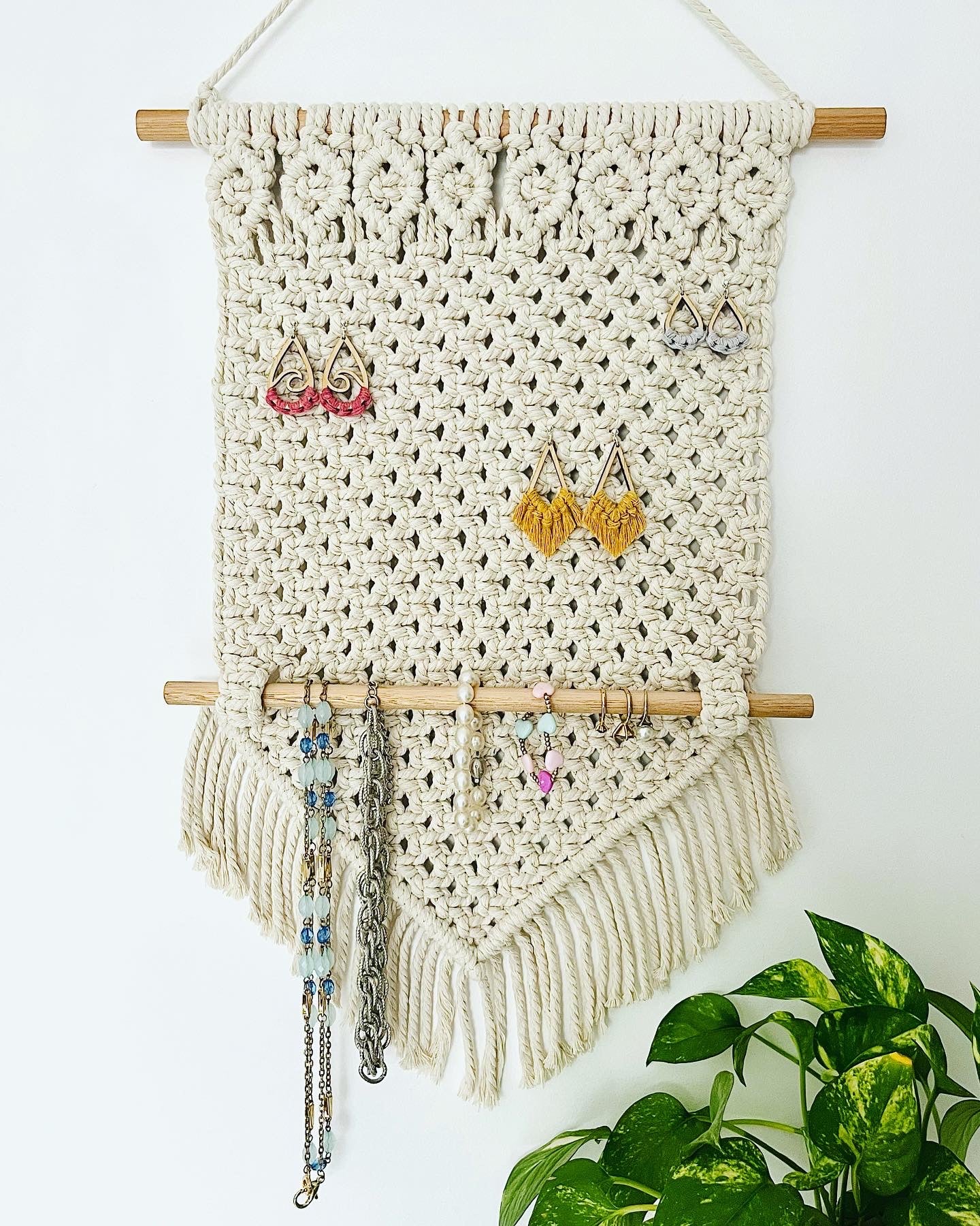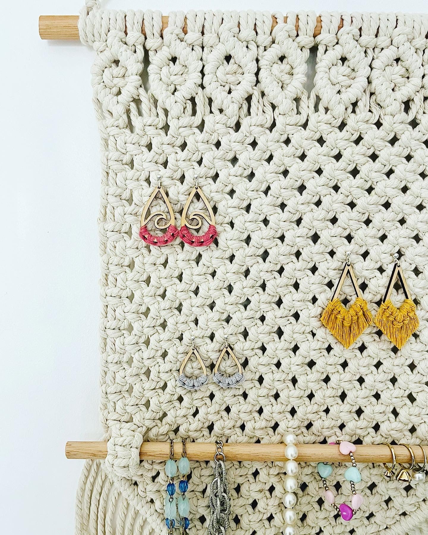 • Suitable for a large range of earrings, bracelets, rings and necklaces. Just slide your bracelets, rings or necklaces onto the dowel and hook your studs or hook earrings into the macrame fabric. You will be surprised how easy and secure they hold on