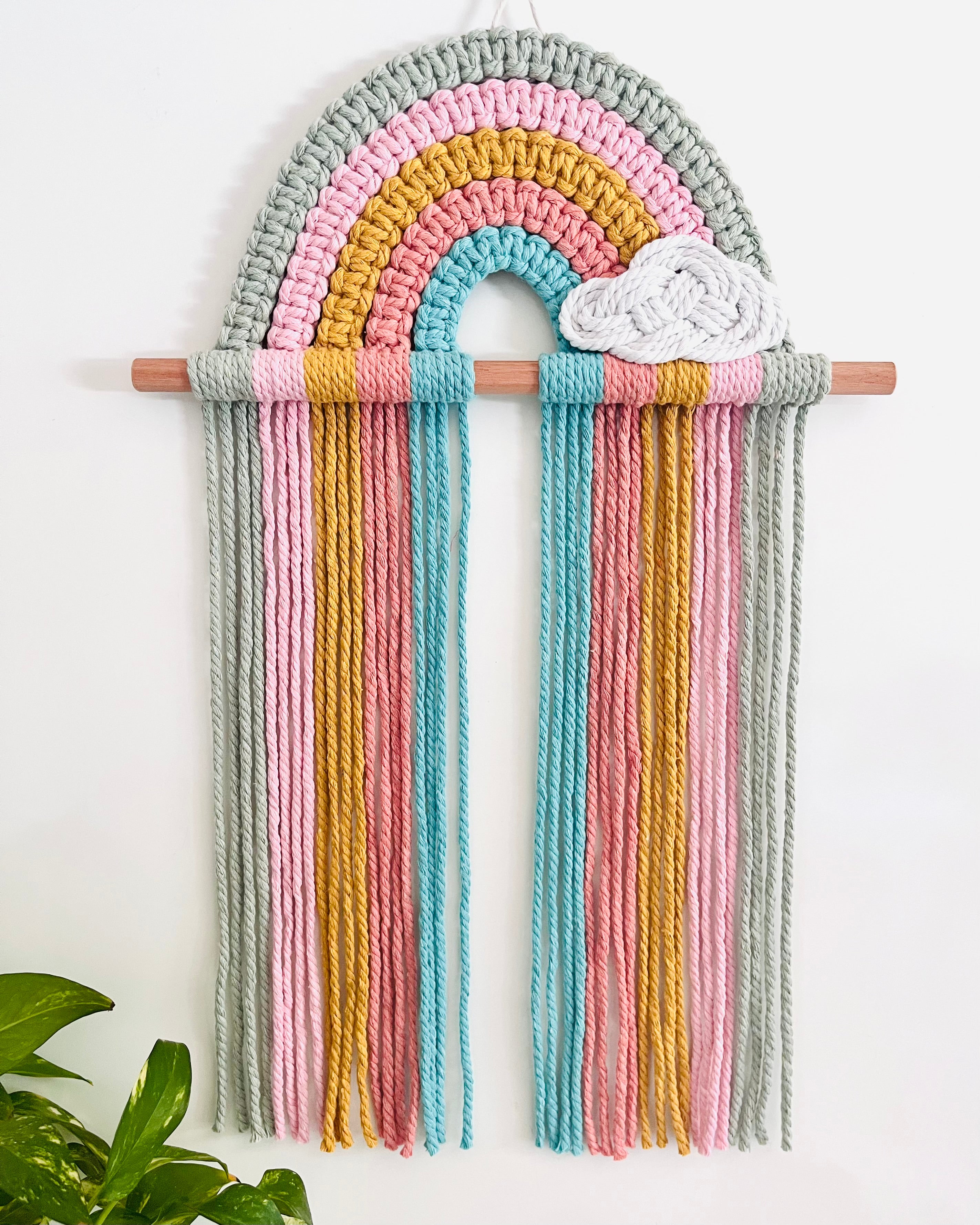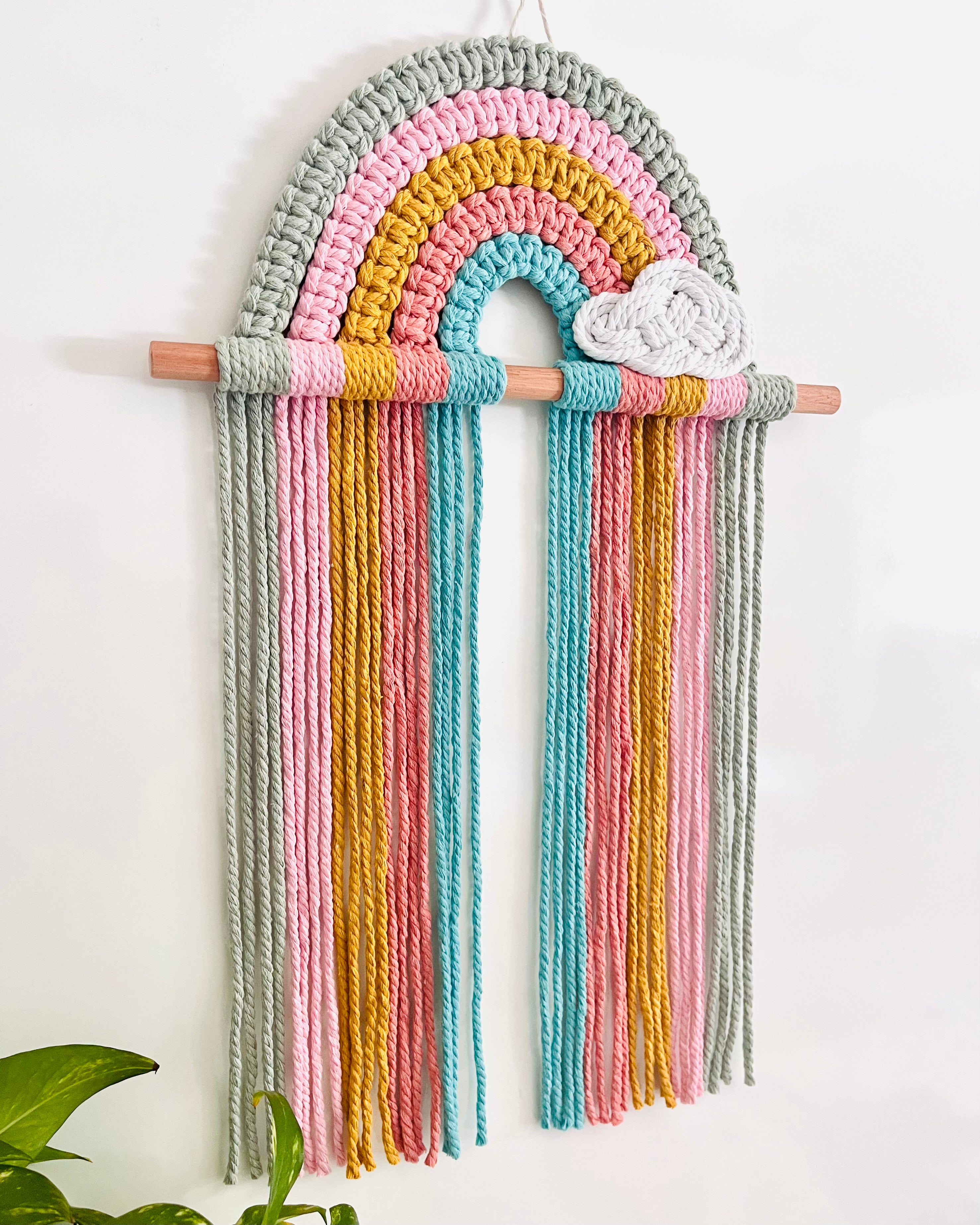 - The rainbow is made of 100% recycled 5mm cotton cord in the colours softest sage, dusty pink, mustard, vintage rose and mint with a crisp white cloud, featured on a solid oak dowels