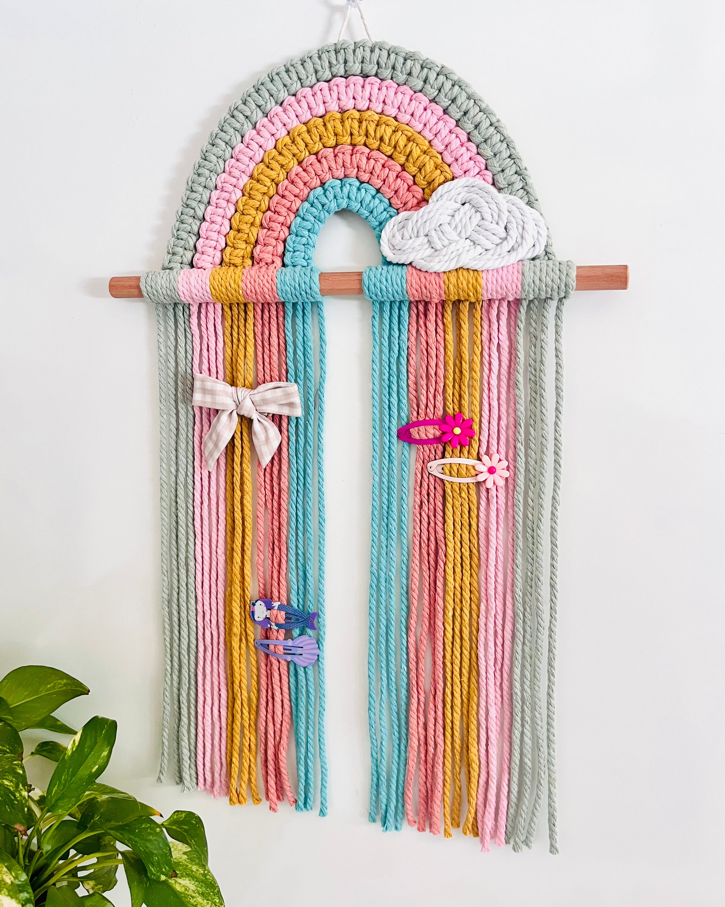 This macrame rainbow hair clip storage hanger is a super practical and at the same time decorative storage solution for your little girl. Just hang her collection of hair clips all in one place and easily accessible anytime.