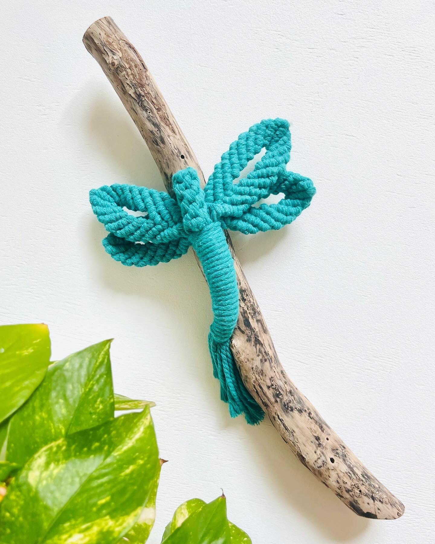 - Detailed hand-knotted macrame dragonfly in teal cotton
