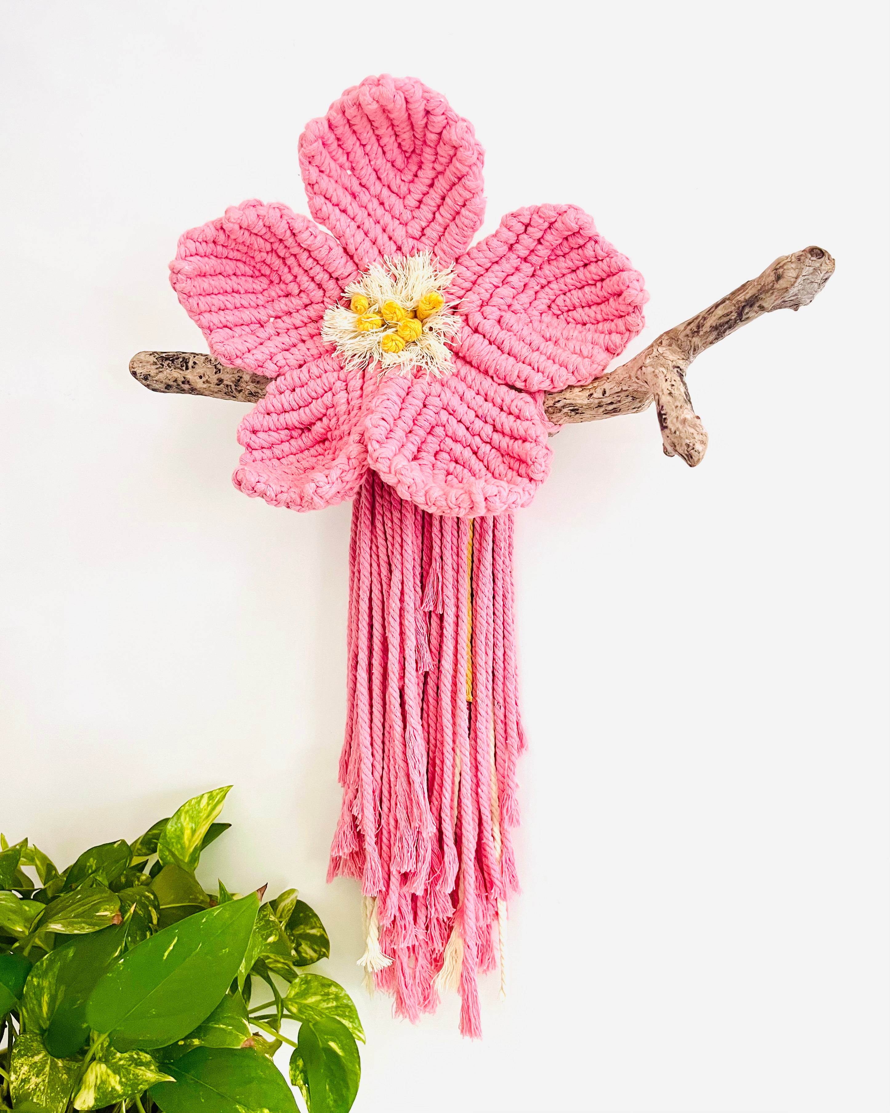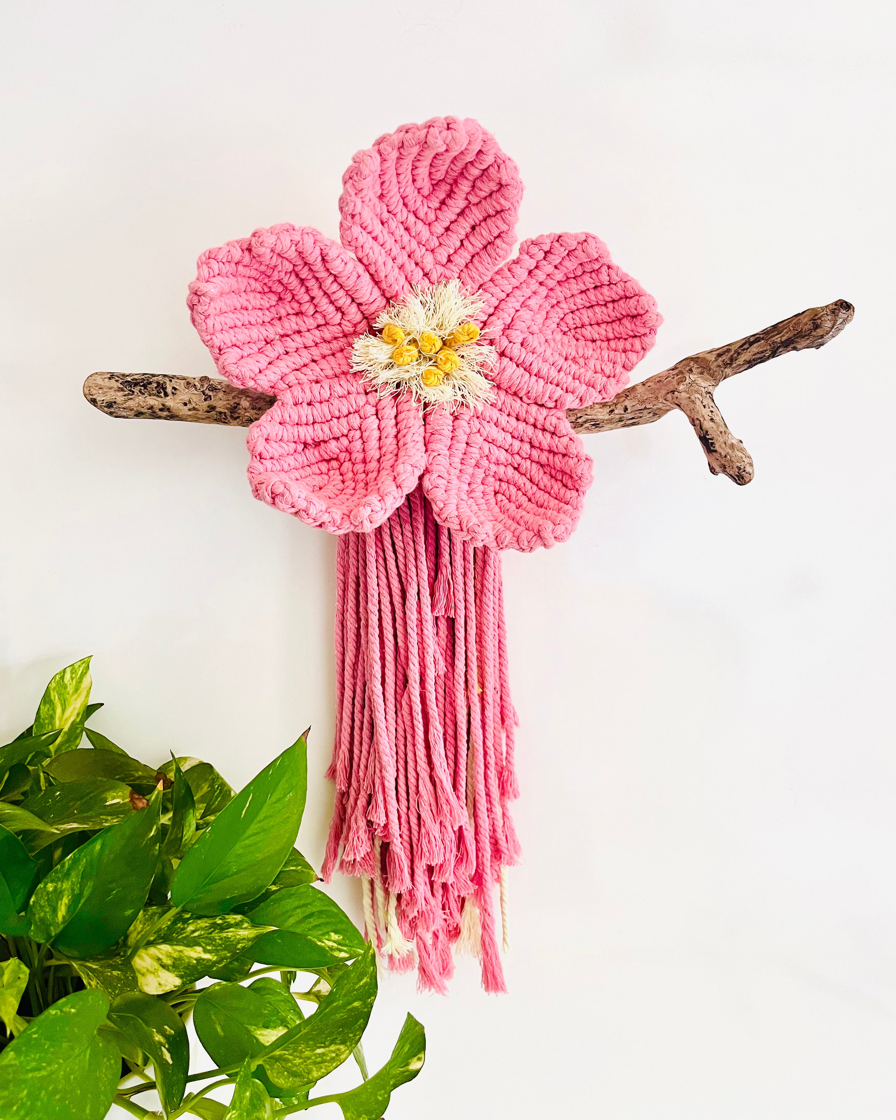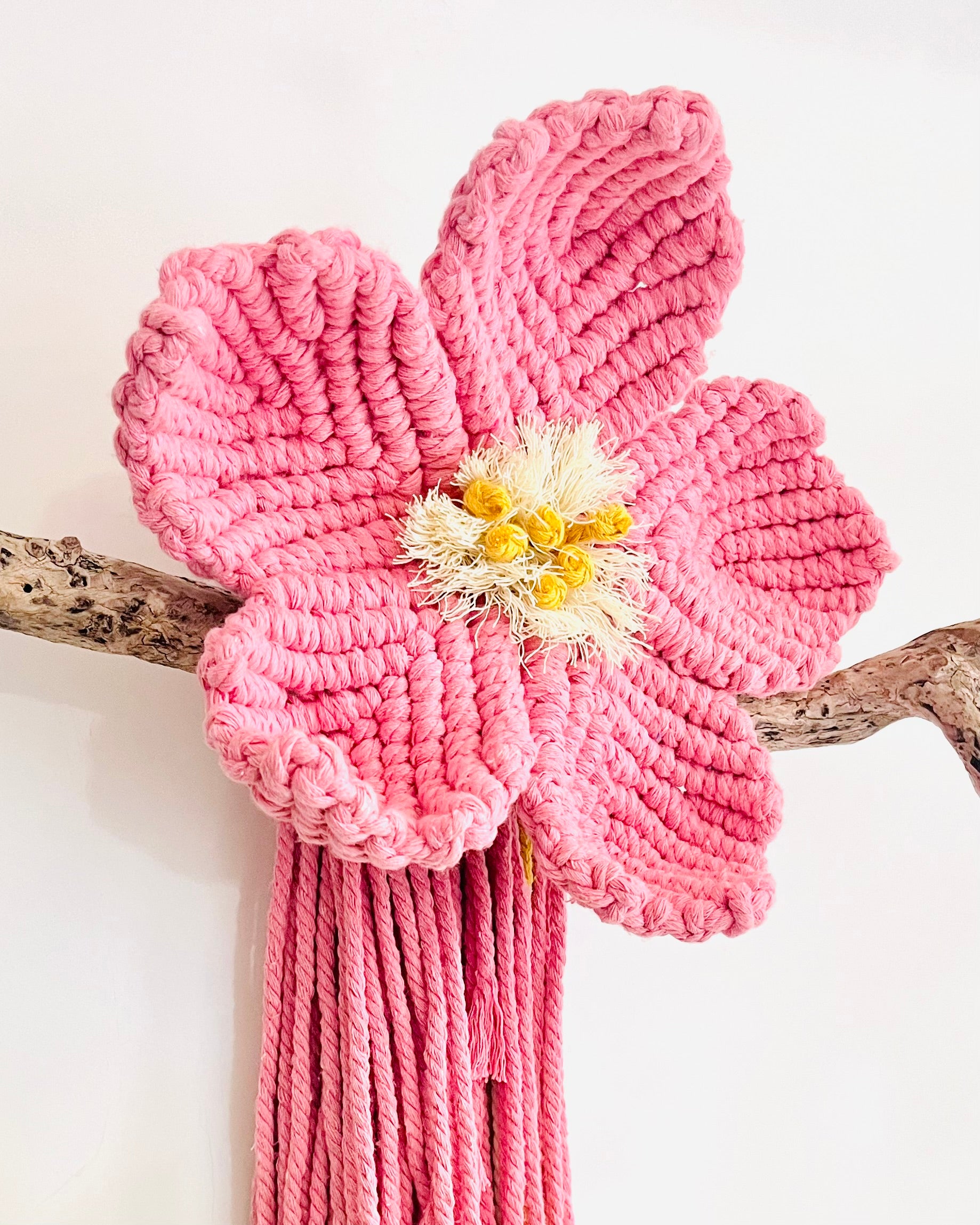 Delicately handcrafted with blush pink, warm mustard and a touch of fresh lemon, the “Dusty Rose Flower” macrame wall hanging brings a soft, feminine charm to any space. Mounted on locally gathered driftwood, it’s a truly unique statement piece full of texture and natural beauty.