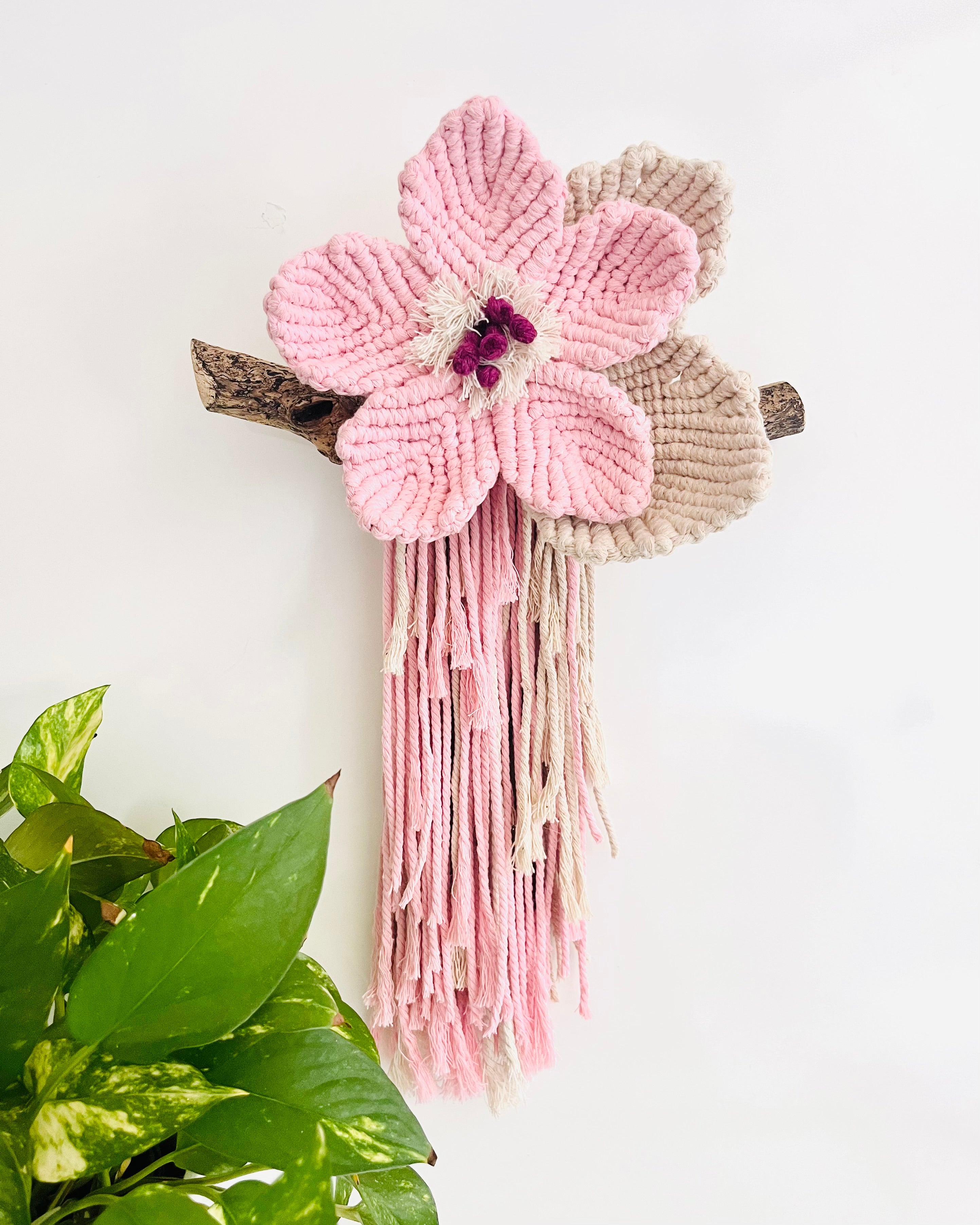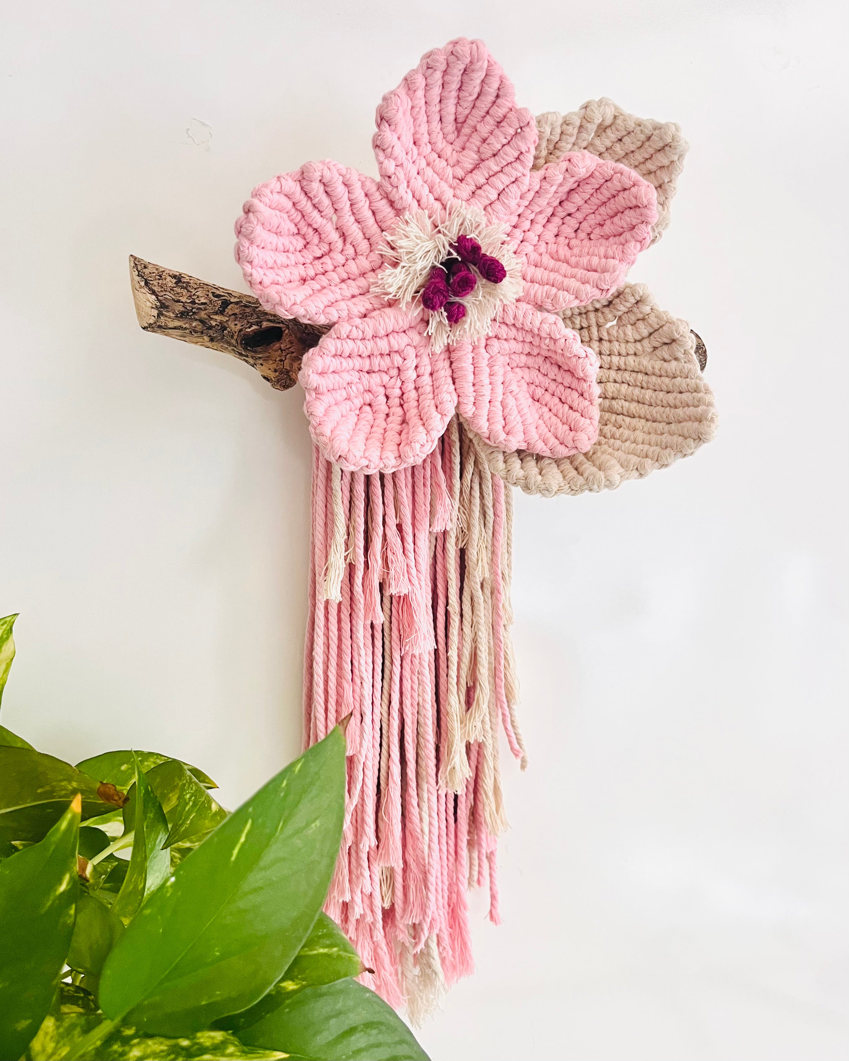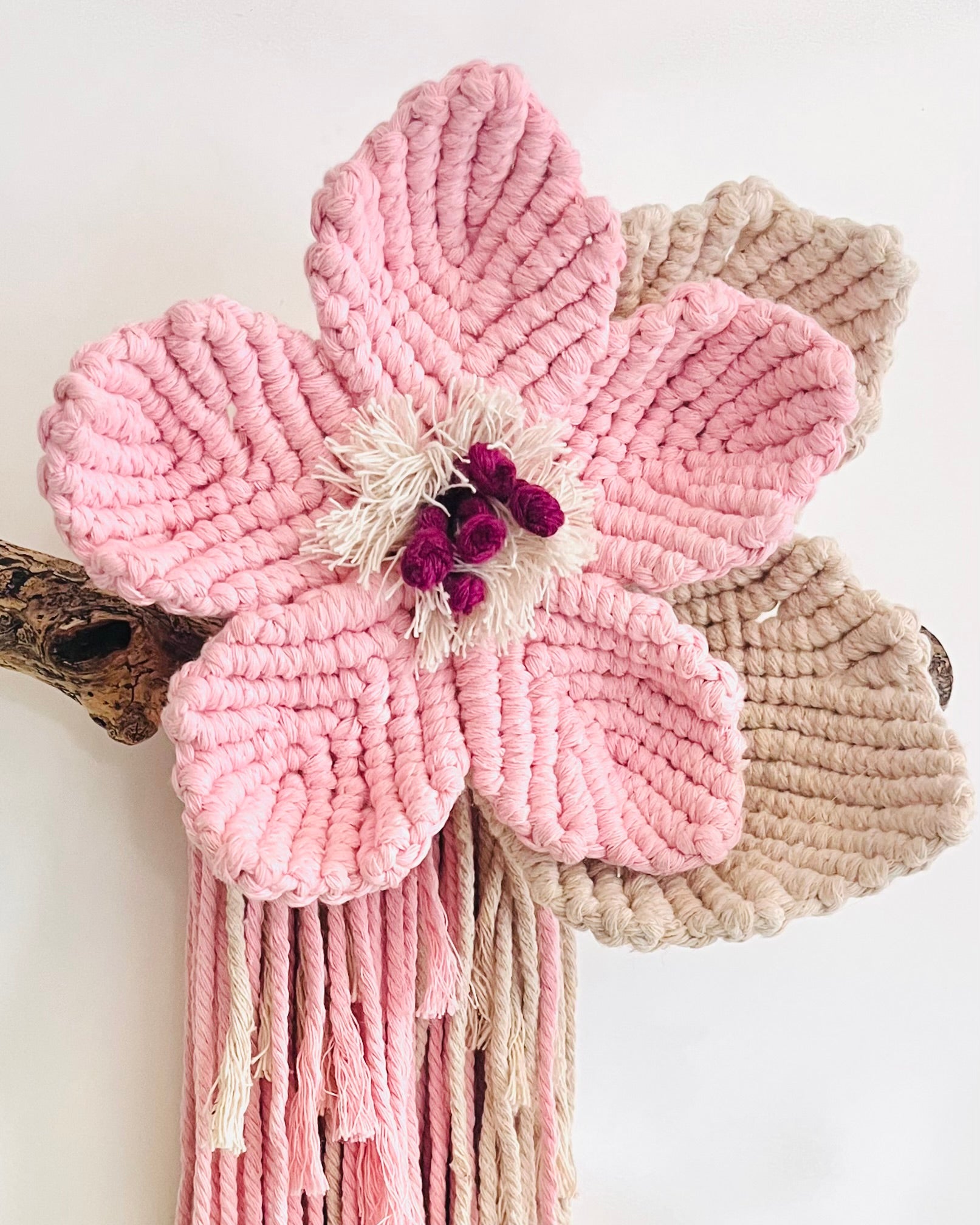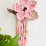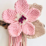 Delicately handcrafted with soft pink, earthy natural and a touch of deep purple, the “Pink Meadow Flower” macrame wall hanging brings a soft, feminine charm to any space. Mounted on locally gathered driftwood, it’s a truly unique statement piece full of texture and natural beauty.