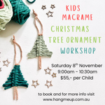 - What they will get: 1.5 hours of fun, creativity and light refreshments. All macrame materials needed to create a macrame Christmas Tree Ornaments in a range of colours